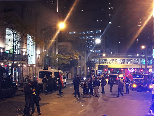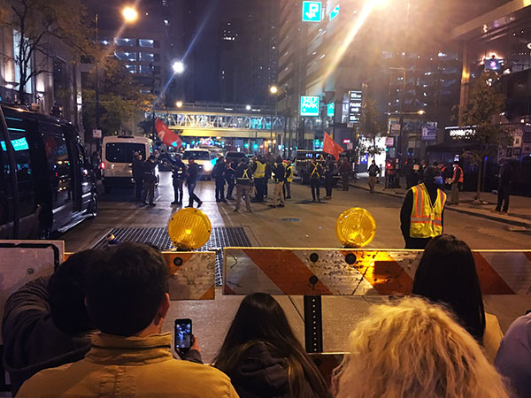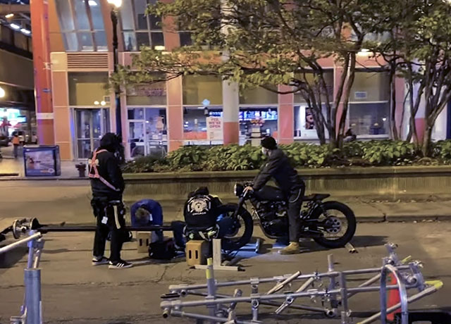 Exclusive photos from the scene of The Batman being filmed this weekend in the Chicago Loop at 100 W Randolph. This appears to be a continuation of a scene being shot in Liverpool where Bruce (Robert Pattinson) and Selina Kyle (Zoë Kravitz) are being chased on motorcycles.